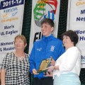 James Connaire receives his U16 Schools Player of the Year award from Marie O’Toole of Basketball Ireland at the Arena on Saturday.
